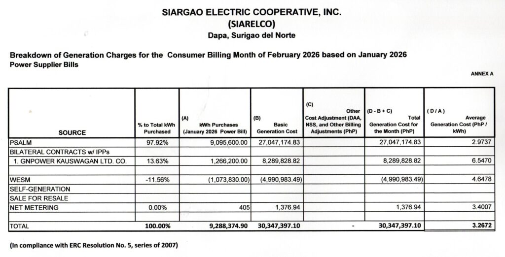 Breakdown of Generation Charges for the Consumer Billing Month of February 2026 based on January 2026By Joel Espinido / March 26, 2026